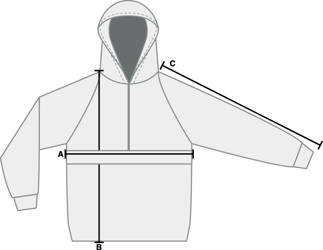 | Tamanho | Largura (A) | Altura (B) | Manga (C) |